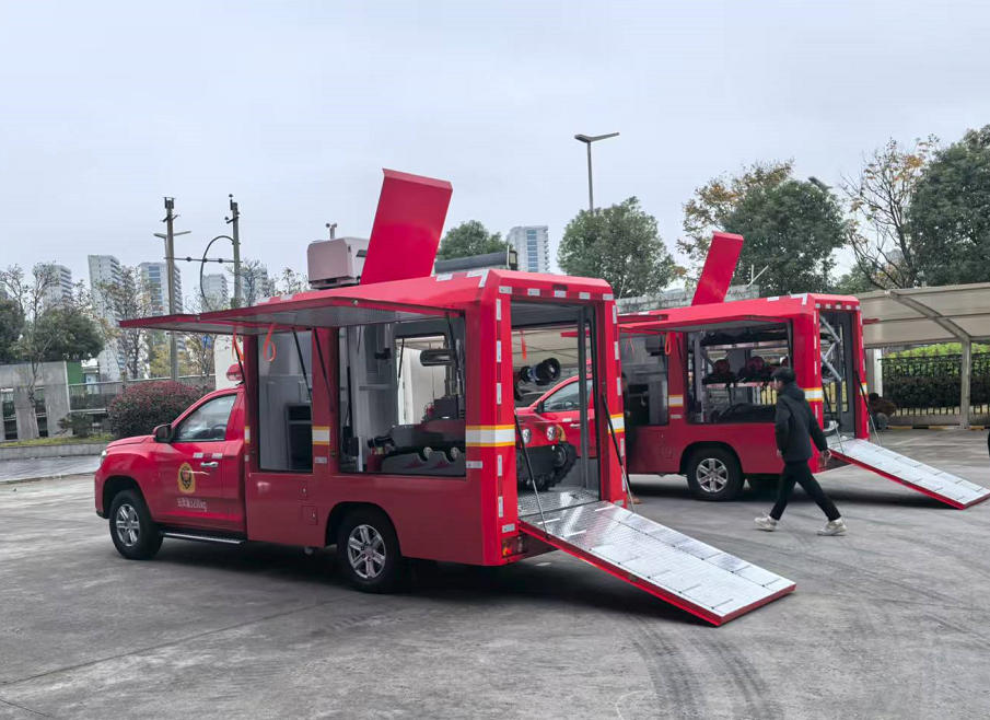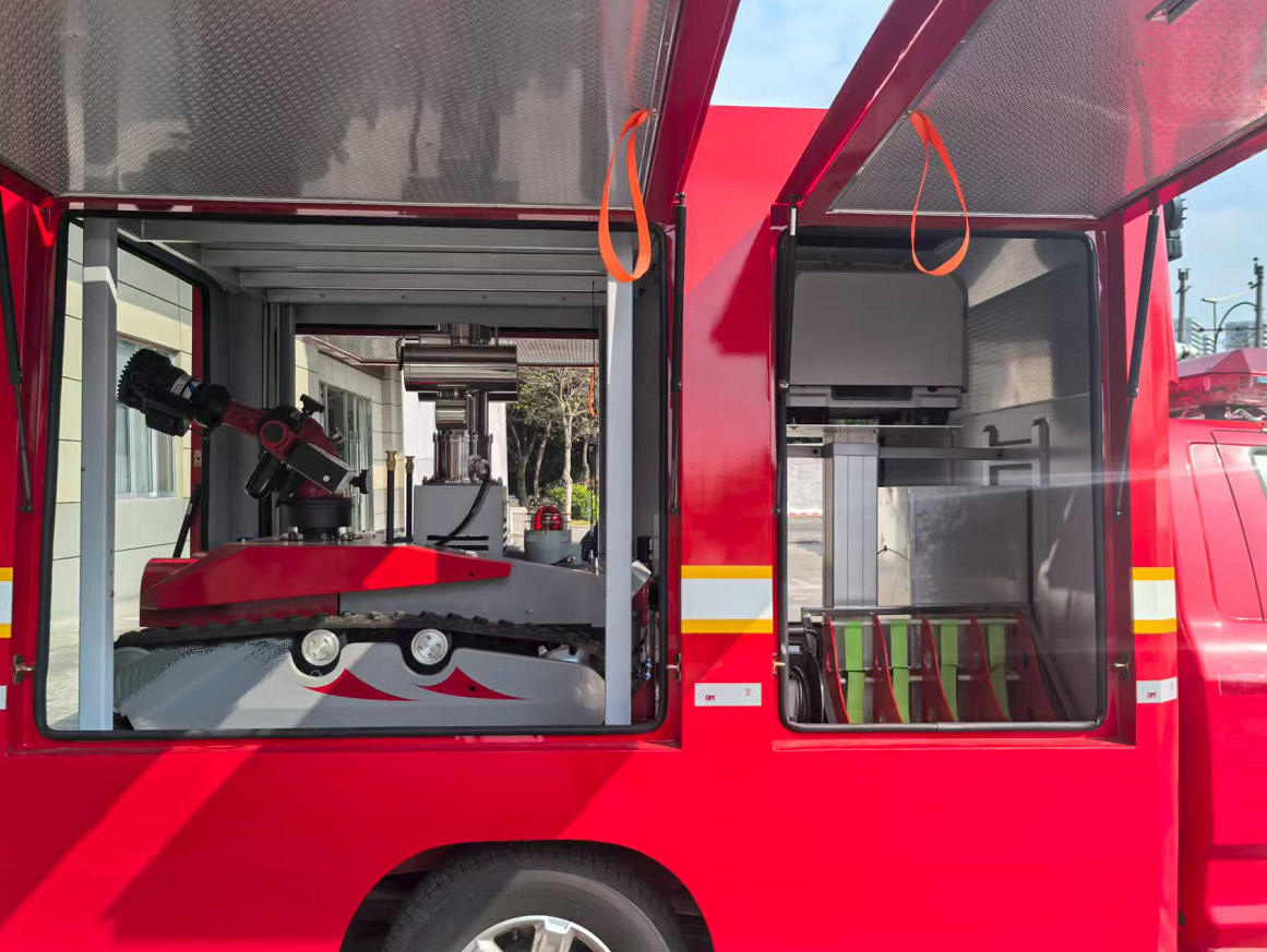 基于皮卡车改装的应急消防救援车,依托其强承载、高通过、长续航等优势,集成侦察无人机、系留照明无人机、车载侦察机器人、车载灭火机器人,面向火灾、危化品泄漏、坍塌等高危场景,兼具日常巡逻功能,实现现场侦察、全域照明、应急消防三位一体,打造空地一体、侦灭联动的移动应急消防救援体系,以智能载体赋能消防救援,避免人员风险、提升高危场景应急处置能力与救援效率。